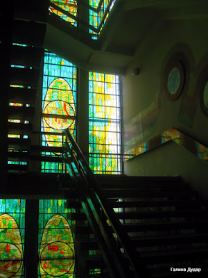 Забрели з Артемчиком у наш Краєзнавчий музей. Давно не були, кілька років, мабуть. А там - нові експозиції. А ще - ось така краса. Не втрималась - сфотографувала. Надворі було досить сонячно, то й крізь це кольорове скло пробились його промені і відбили малюнки на підлозі, перилах. Краса!